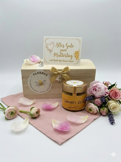 Verschenke puren Genuss mit unserer personalisierbaren Muttertagsbox. Wähle zwei Gläser unserer regionalen Honigschätze (je 200 g) aus.