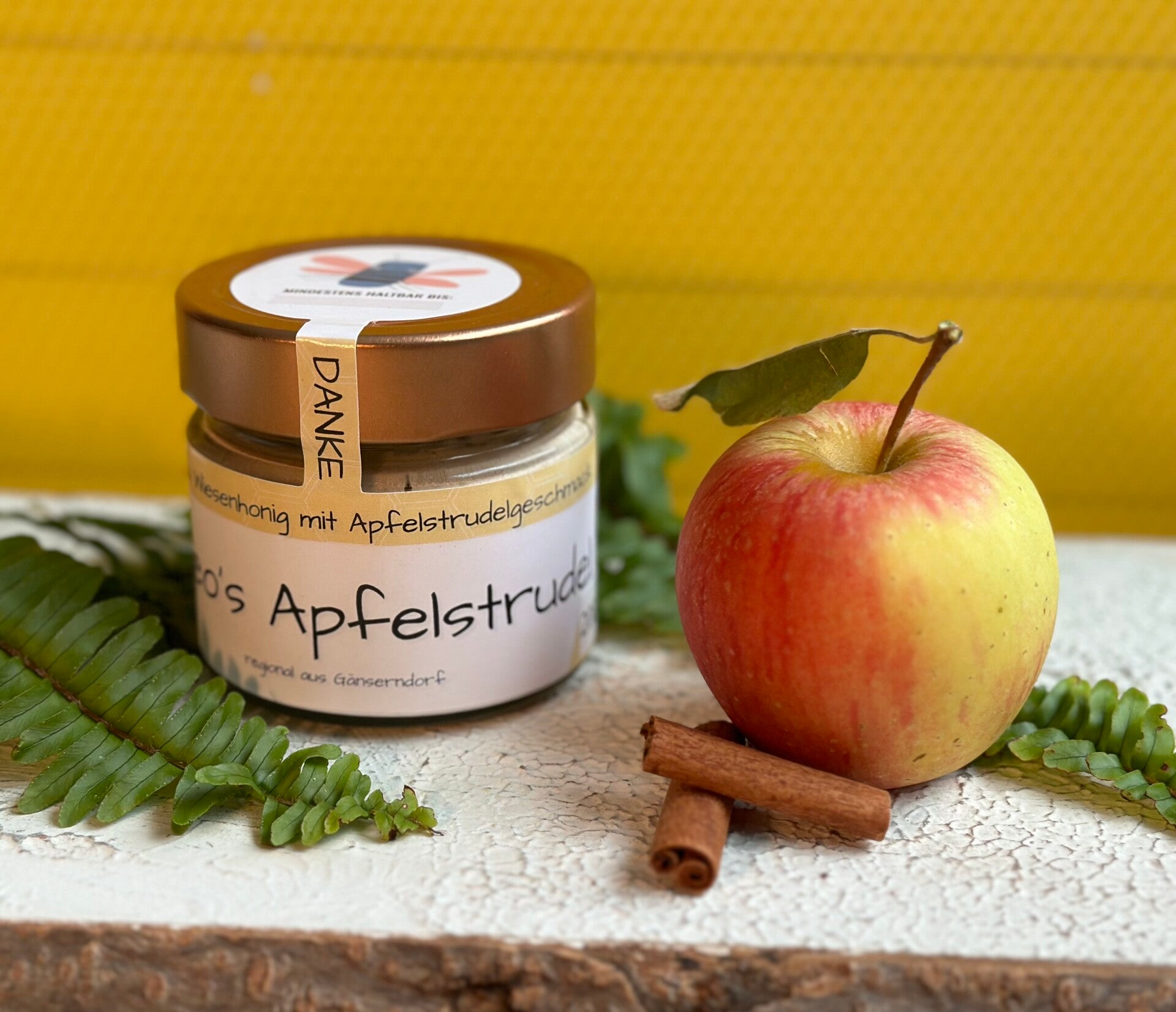 Unser Cremehonig Leo‘s Apfelstrudel wird mit einer Mischung aus Zimt, Kardamon, Vanille, Ingwer, Piment und Nelken verrührt. Auf die Frühstückssemmel aufgetragen, im Müsli oder auch im Grieskoch entfaltet sich der volle Apfelstrudel -Geschmack im Mund. Mein Papa kam oft von der Schule heim und es roch im ganzen Haus nach Apfelstrudel, seine Mama hatte wiedermal ein ganzes Backblech mit Apfelstrudel gezaubert.